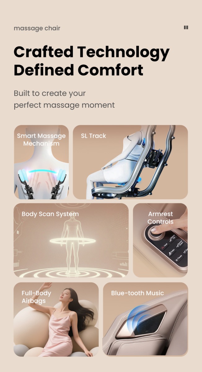 يوفر كرسي الراحة تجرية تدليك فاخرة وعلاجية مصممة لتخفيف التوتر والضغط على الراس الى اسفل القدمين ومع تقنية متقدمة لضمان جلسة مخصصة ومريحة مما يجعله مثالي للاستخدام اليومي المنزلي والروتين الصحي لتعزيز الاسترخاء وتحسين الصحة العامة